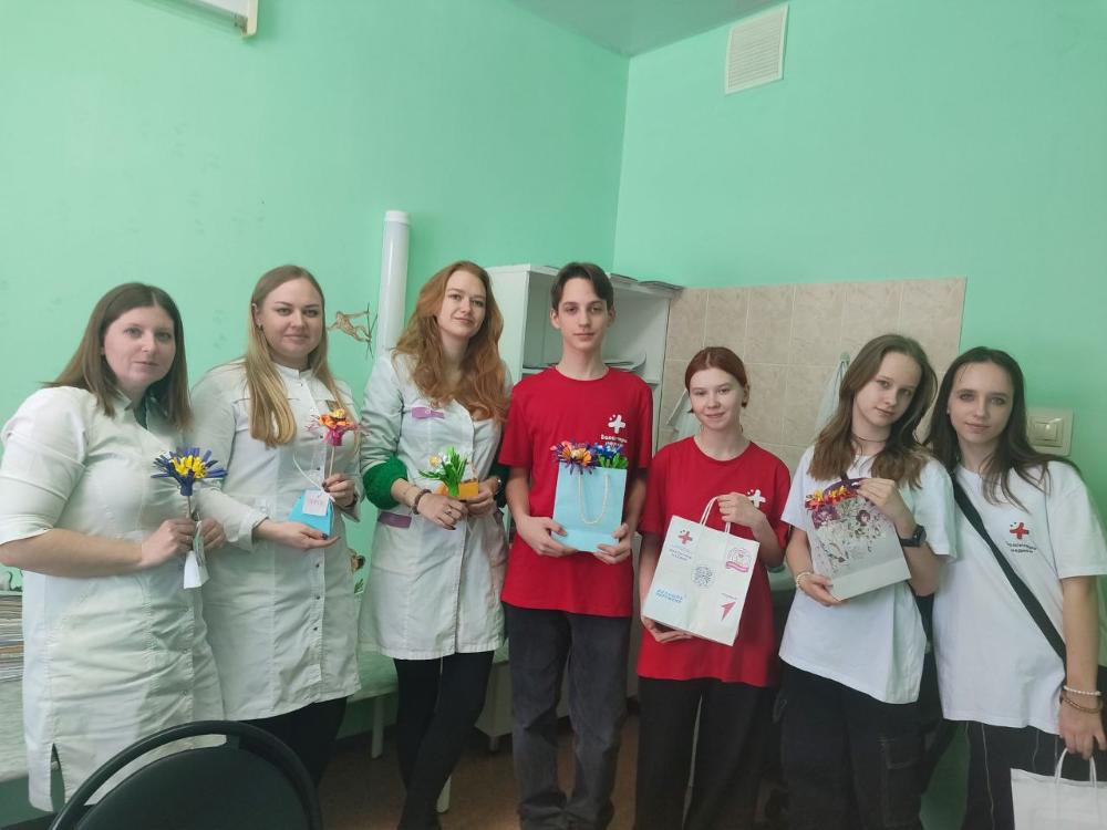 С праздником 8 Марта медицинских работников детской поликлиники №6 поздравили юные волонтеры-медики